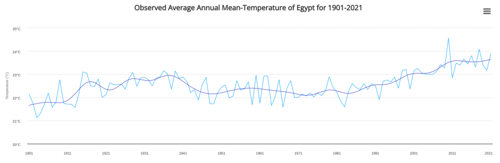 Across the country, farmers rely on water from the Nile to keep their crops healthy; however higher temperatures on the already water-scarce land will cause further drought. The average temperature has been consistently increasing as highlighted in this chart.