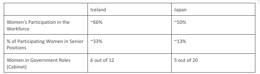 For the past several decades in Iceland, many women have had leading positions such as prime minister and president. While women are underrepresented in both countries, the underrepresentation is more prominent in Japan.