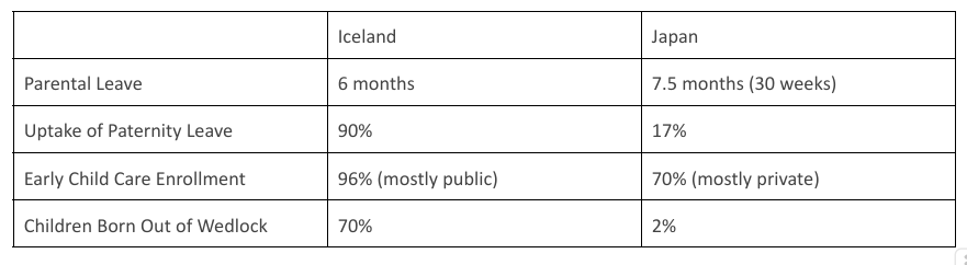 In general, family structures are less conventional in Iceland versus Japan as evidenced by children born out of wedlock. Because of the social structures established, Iceland tends to emphasize gender equality and an equal share of household responsibilities. Icelandic fathers are entitled to less than Japanese ones – who are offered the most generous paternal leave of any nation – but the percentage of fathers who take this leave is higher in Iceland than in Japan. Interestingly, while the proportion of Japanese fathers who take leave is lower than in Iceland, it is worth noting that it has risen significantly – in 2007, only 2% of Japanese fathers took paternity leave whereas now 17% do. Daycare is also more accessible in Iceland than it is in Japan. Iceland spends 1.7% of its GDP on early childcare education while in Japan, most children are enrolled in private education with over two thousand kids on waiting lists. More costly education and limited access means fewer kids are enrolled, which places more demands on families: this usually means mothers stay home and care for the children while fathers focus on their careers. Although much progress has been made, Japanese mothers take on more primary caregiving responsibilities while Icelandic mothers have access to more support.